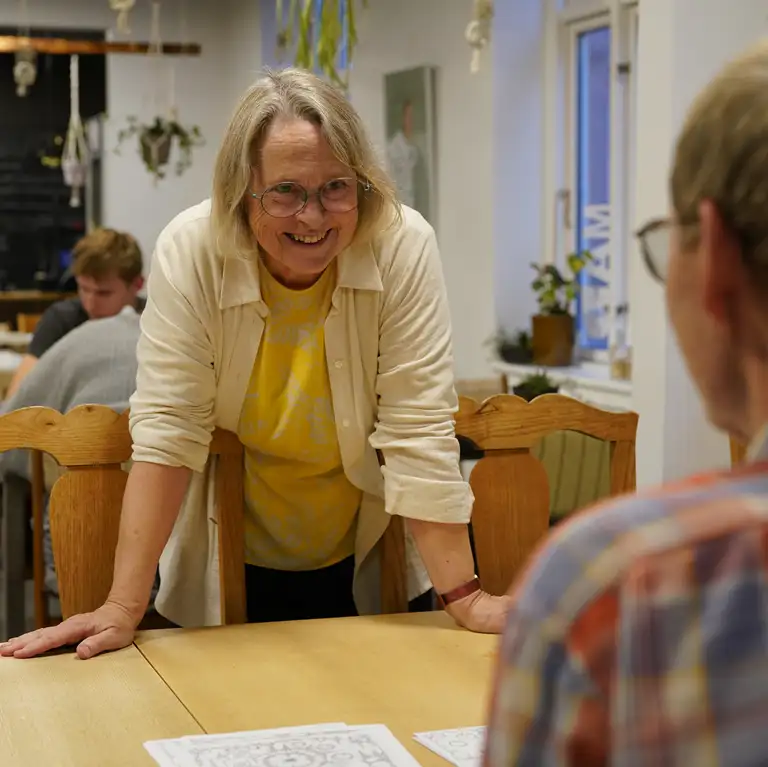 - Jeg underviser ikke på holdene her, men jeg er her til at vejlede og hjælpe, hvis nogen ønsker det. Vi har skabt et frirum, hvor det vigtigste er, at man har lysten til enten at slippe kreativiteten løs og fordybe sig i enten at tegne eller arbejde med broderi, syning, nålefilt eller fx linoleumstryk, siger hun.