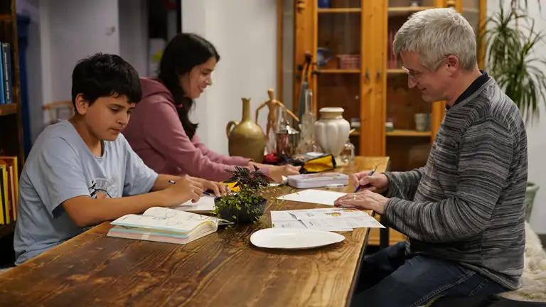 Ved et bord sidder en far med sine to større børn. Den ene er i gang med at tegne den cello uden strenge, som Jytte har fået af musikskolen. Nu fungerer den som tegnemodel. De arbejder koncentreret, mens der indimellem bliver småsnakket hen over bordet om løst og fast fra deres dag på job og i skole.