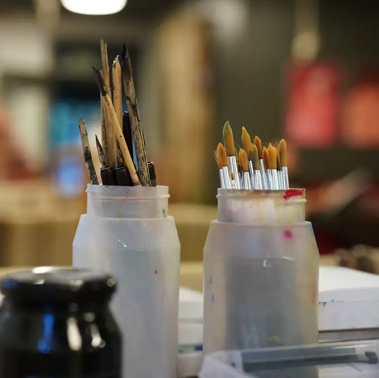 Der er afslappende musik i højtalerne. De store borde i fællesrummet ved cafeen er fyldt med forskellig slags papir, viskelæder, blyanter i blandede tykkelser og farver, akvarelmaling, pensler og bøger om at tegne og male. Klokken er lidt over 19 en tirsdag aften i september, og der kommer stadig nogle ind ad døren for at være med.