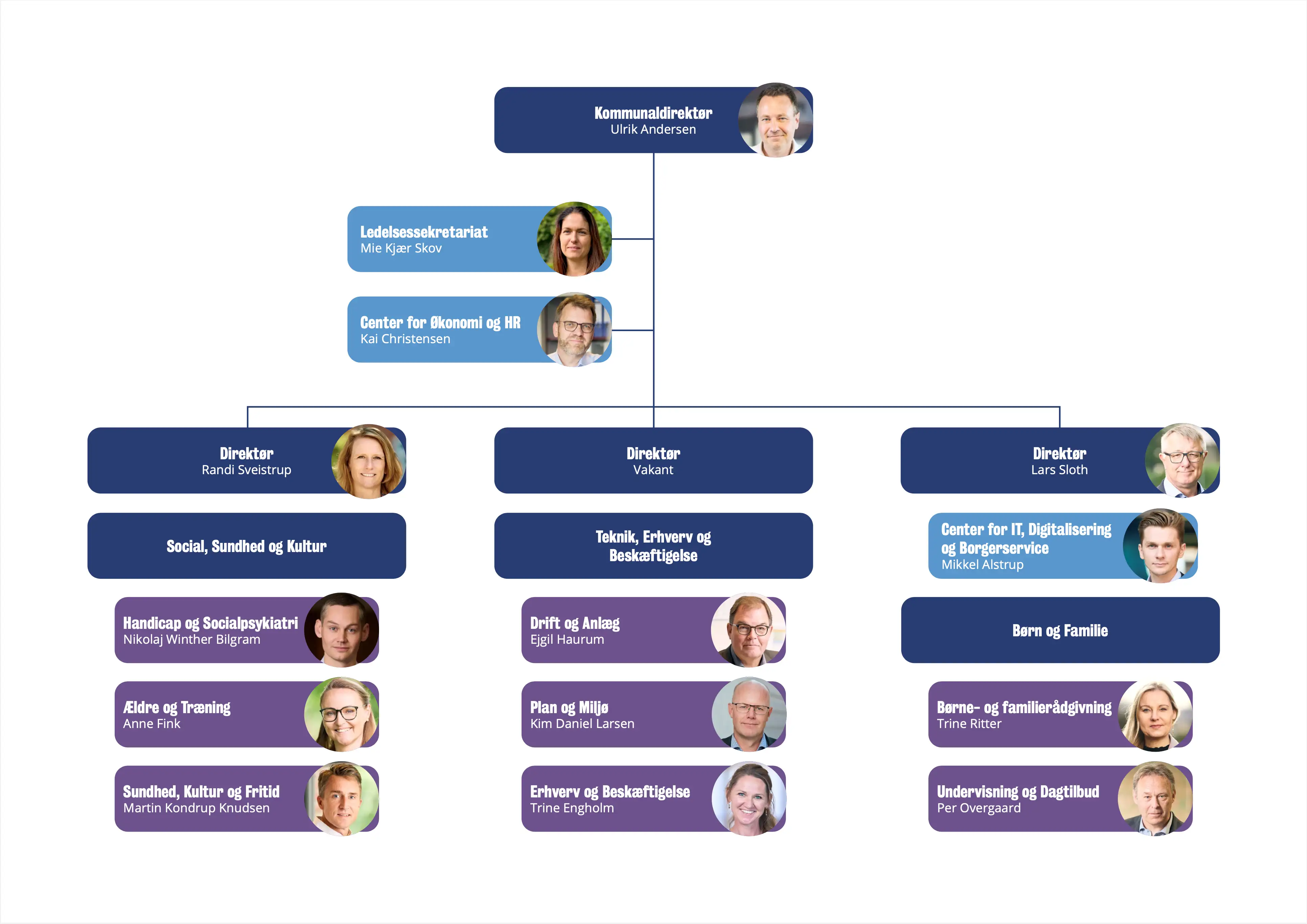 Overordnet organisationsdiagram med direktion, chefer og forvaltninger. Kan du ikke læse organisationsdiagrammerne her på siden, er du velkommen til at kontakte Ledelsessekretariatet for en nærmere gennemgang. Du finder kontakt-oplysninger her på siden.