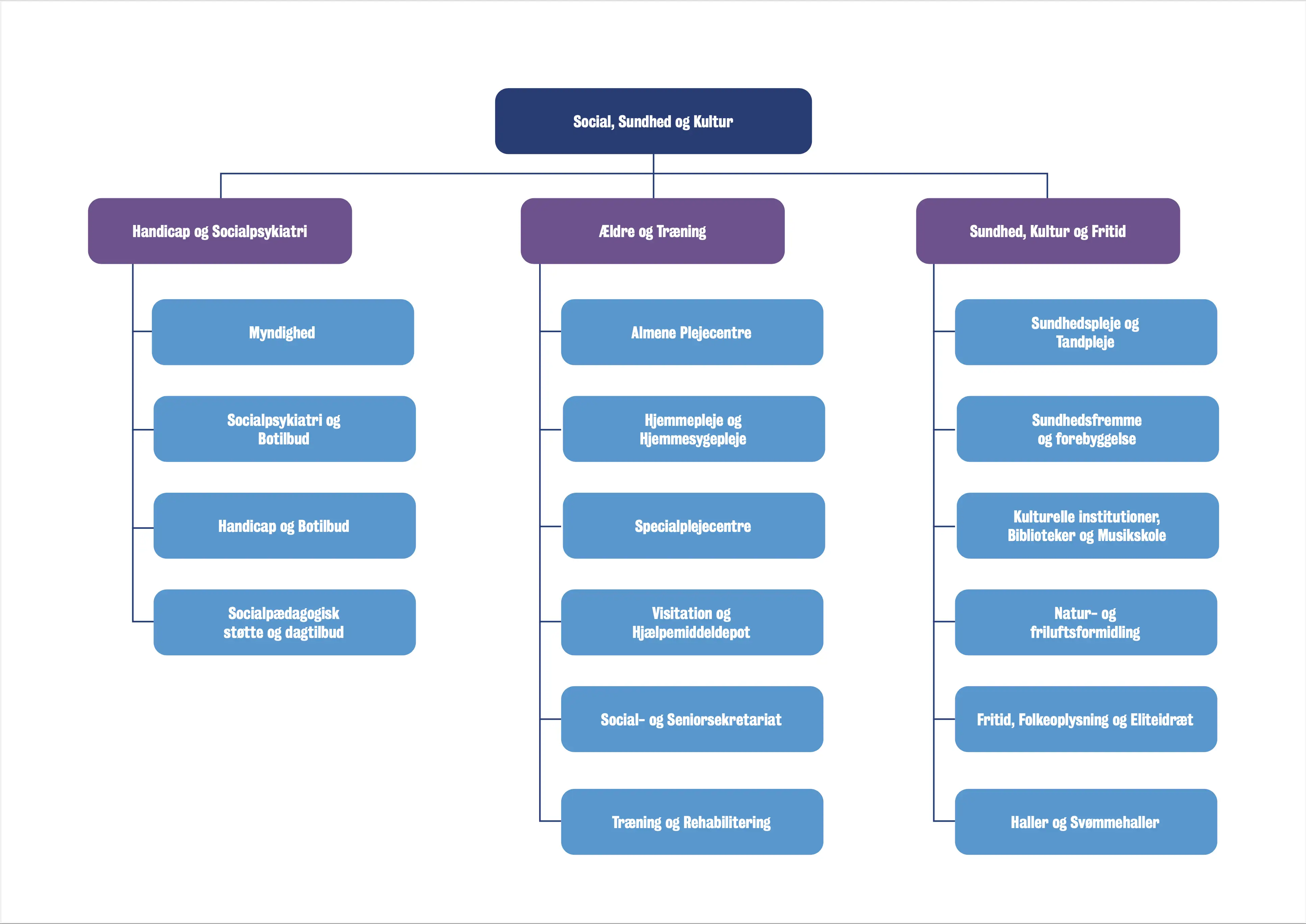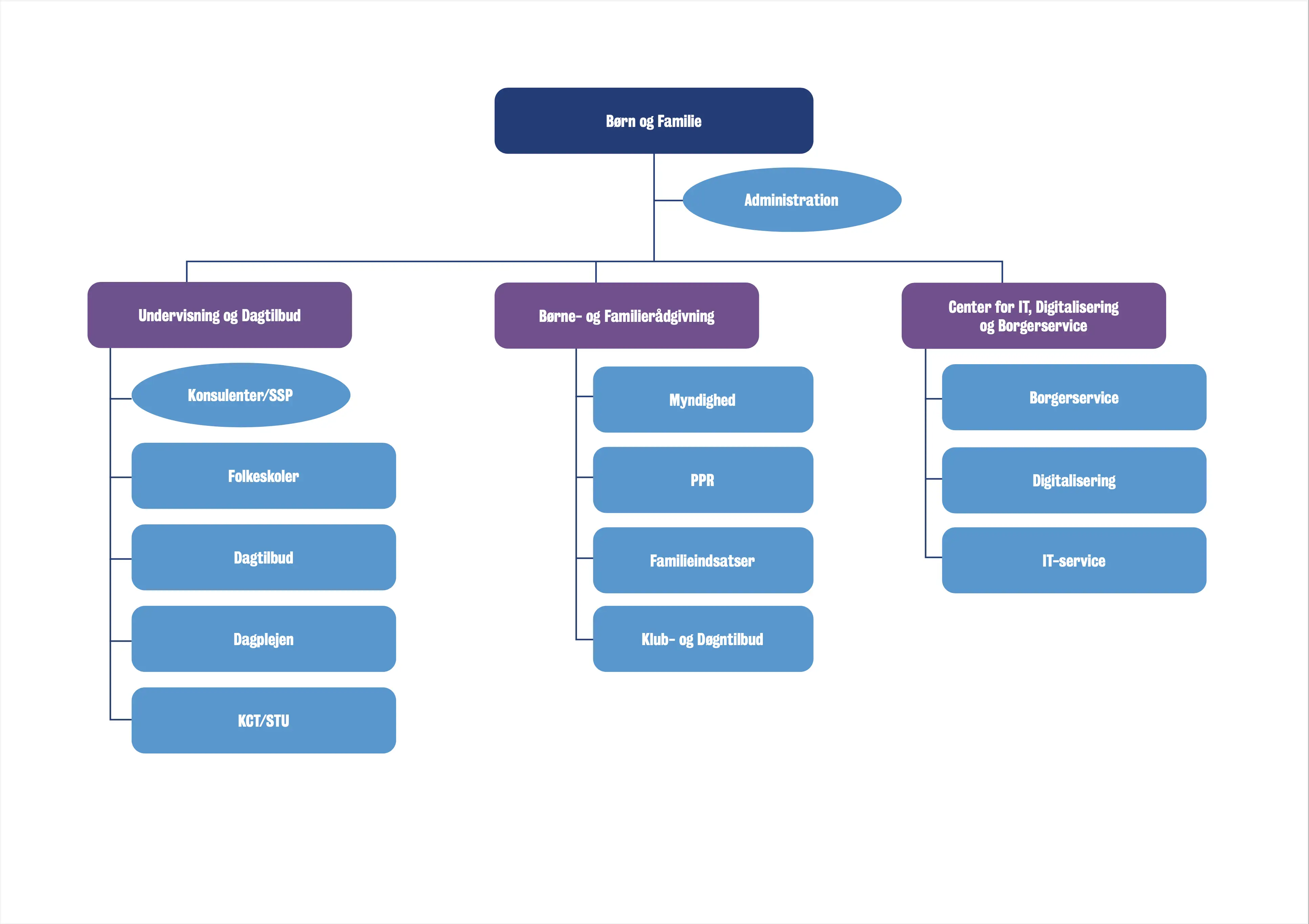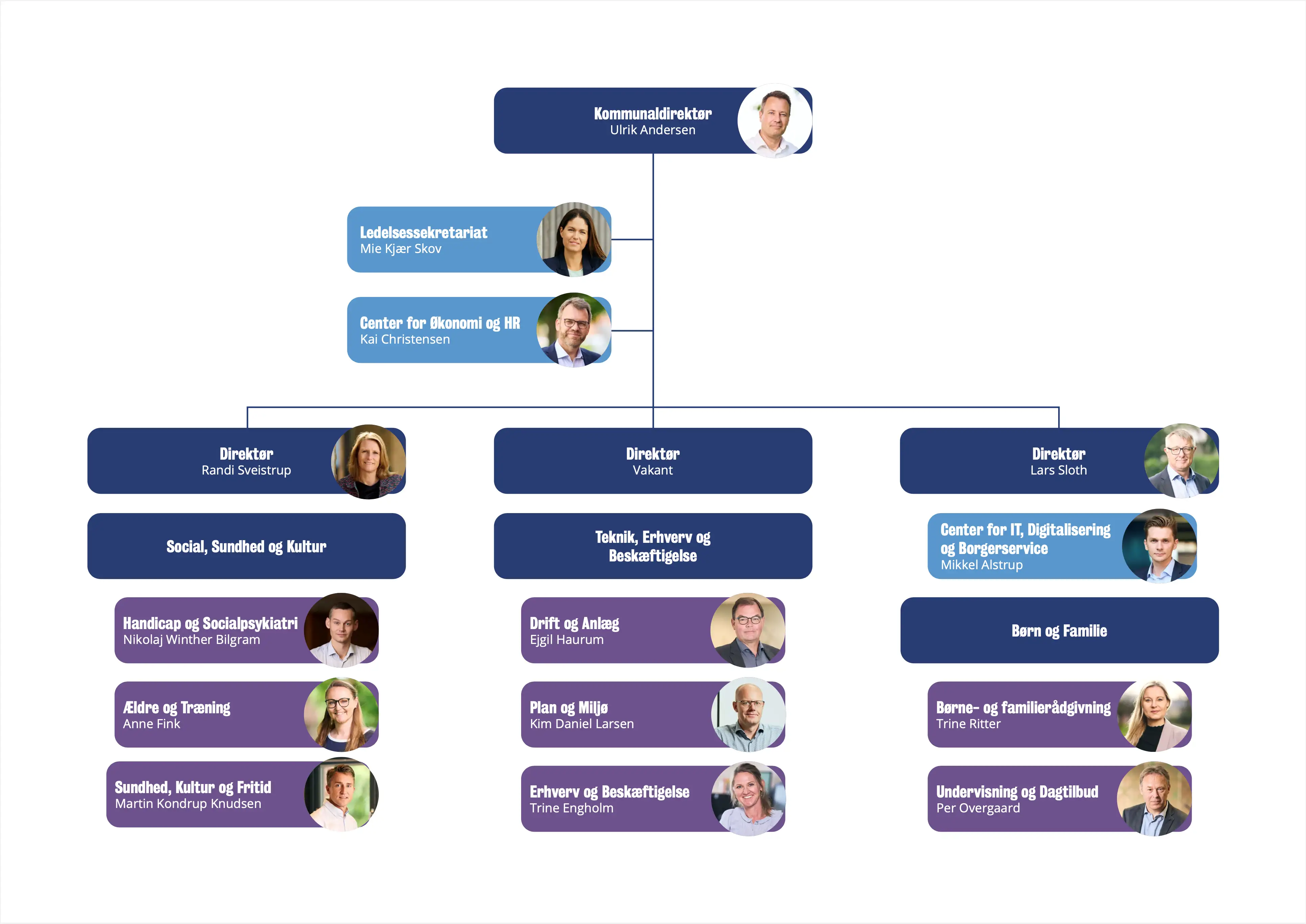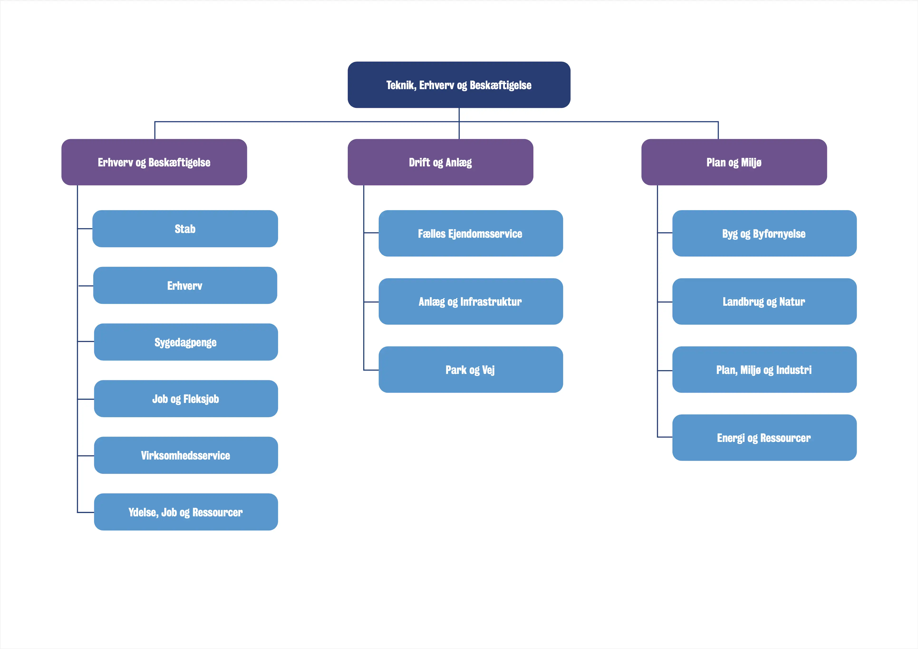 Kan du ikke læse organisationsdiagrammerne her på siden, er du velkommen til at kontakte Ledelsessekretariatet for en nærmere gennemgang. Du finder kontakt-oplysninger her på siden.