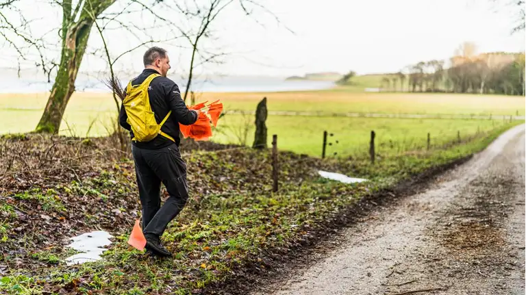 • Du finder rundt ved at følge de orange flag, som normalt bliver brugt til Thy Walk n' Run.