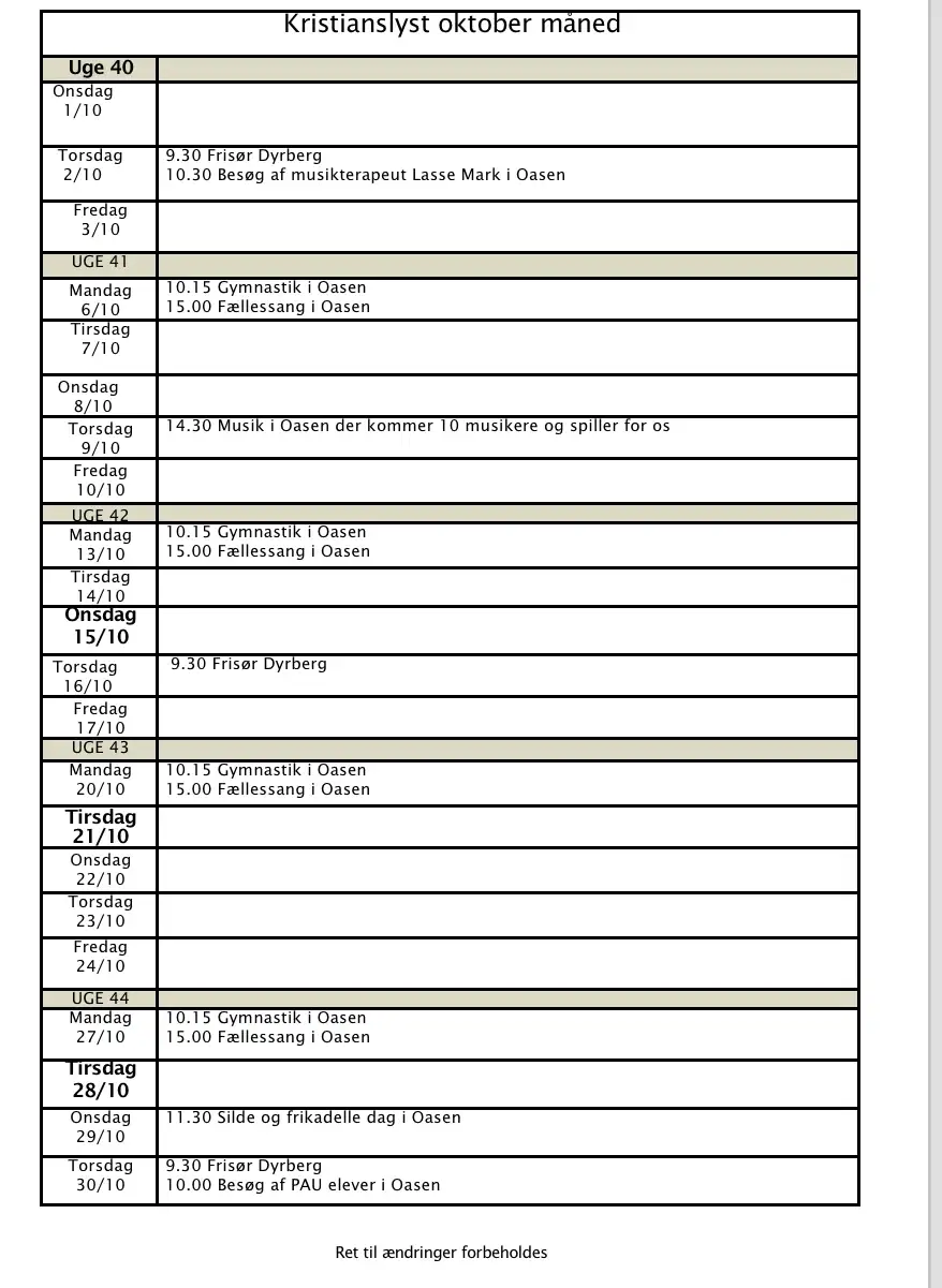 Frisør: Der er tilknyttet en frisør som kommer fast i huset hver anden uge. Der hænger sedler i afdelingerne, hvor du melder dig på.